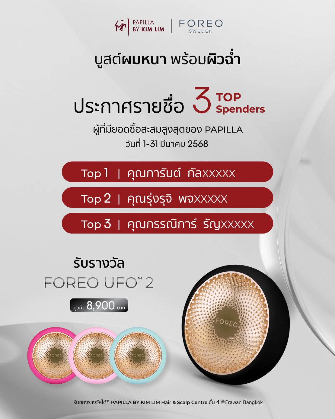 ประกาศรายชื่อ 3 Top Spenders ผู้ที่มียอดสะสมสูงสุดจากกิจกรรม PAPILLA X FOREO!