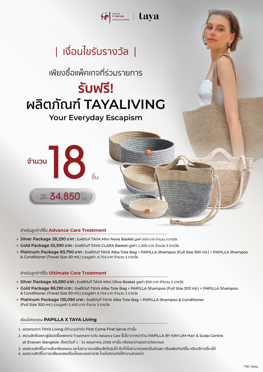 • Platinum Package 83,790 บาท: รับฟรีทันที TAYA Alba Tote Bag + PAPILLA Shampoo (Full Size 300 ml.) + PAPILLA Shampoo & Conditioner (Travel Size 50 ml.) รวมมูลค่า 4,754 บาท จำนวน 3 รางวัล