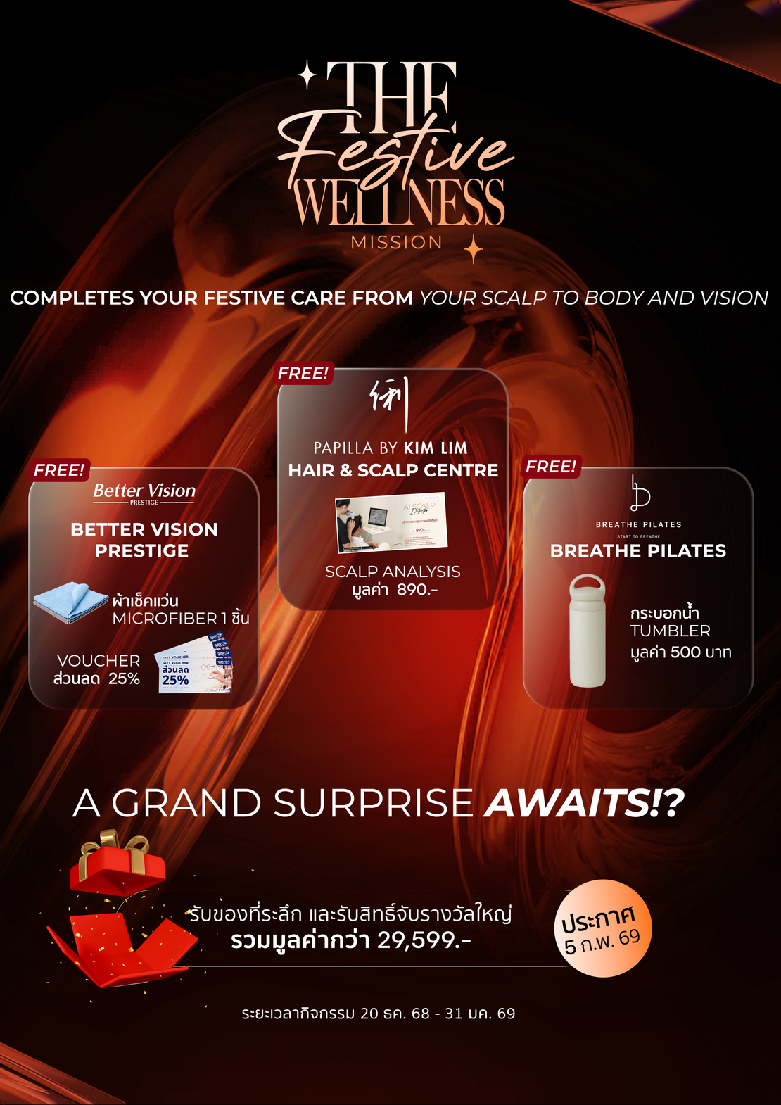 **ประกาศผลรางวัล ในวันที่ 5 กพ. 2569 เวลา 18.00 น. ผ่านทางเว็บไซต์ https://papillabykimlimth.com/pages/the-festive-wellness-mission และช่องทาง Instagram หรือ Facebook หรือ Line Official ของทั้ง 3 แบรนด์ที่ร่วมรายการโปรโมชั่น