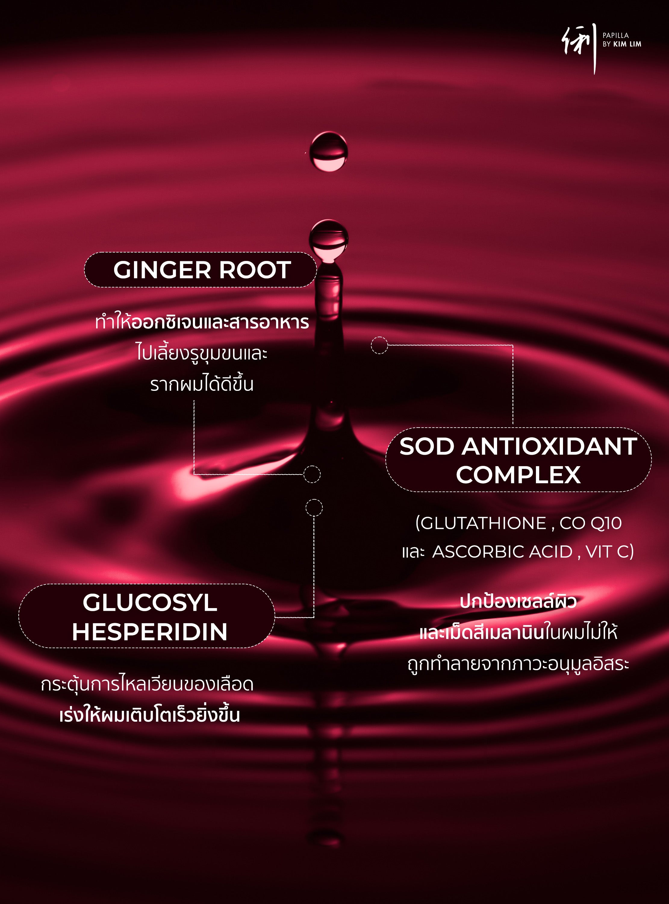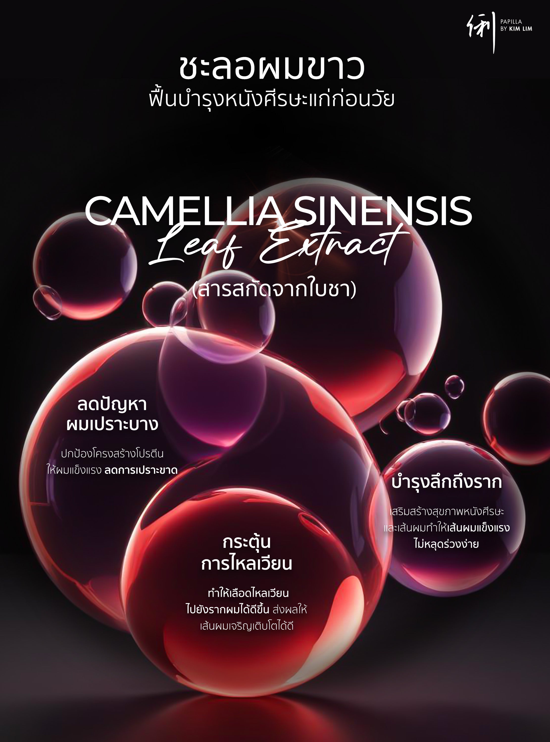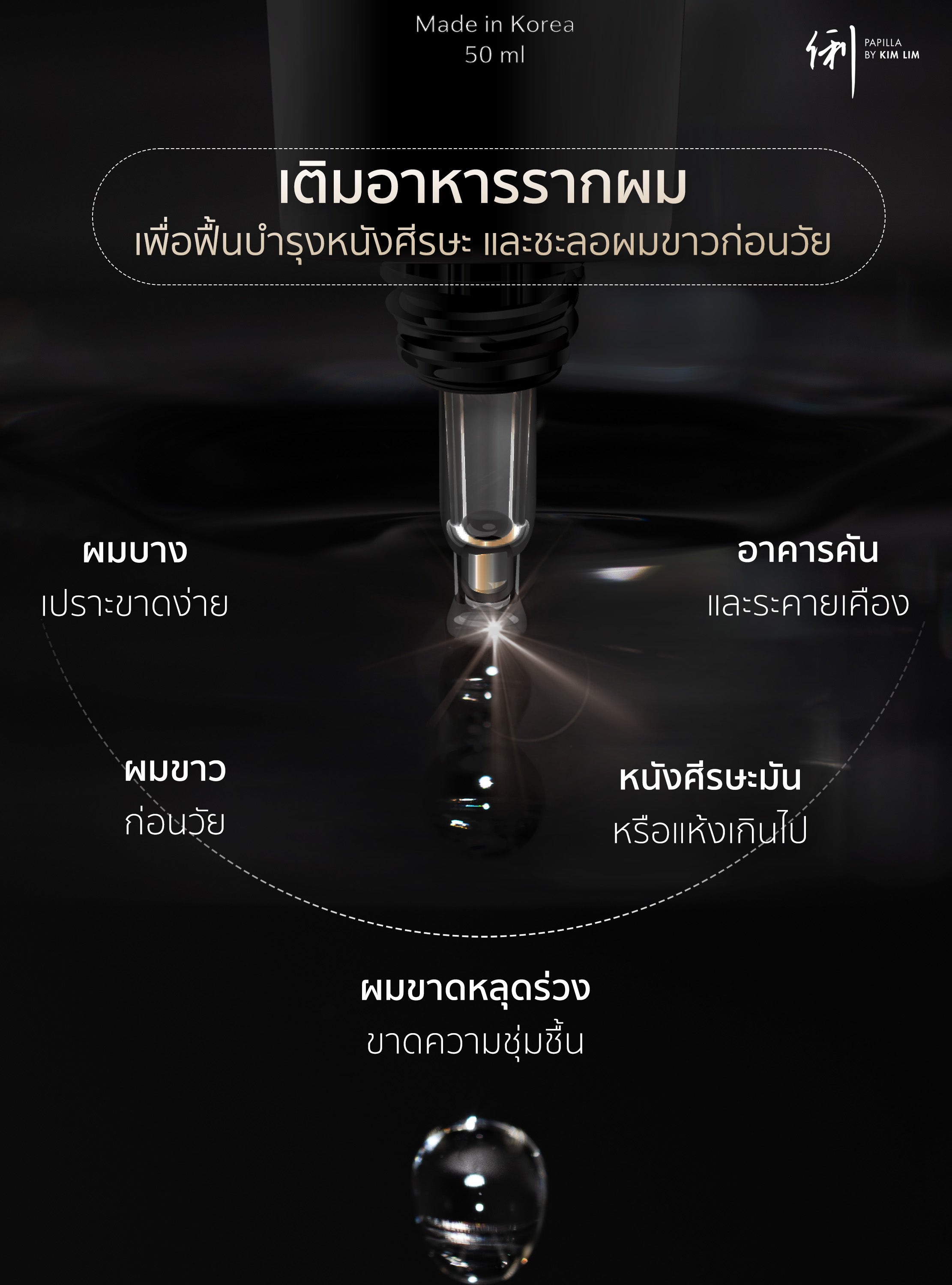 Tonic stimulates stem cells Containing a special formula of melanin stimulating solution that has been developed and certified by hair scientists to restore gray hair to its original state. With ingredients that stimulate Stem Cell, it helps stimulate cells in the hair roots to work again, increase hair volume and maintain hair pigment, making hair thicker, stronger and healthier from the inside out with extracts such as Multi-Peptide Complex, Multi-Molecular Weight Hyaluronic Acid, SOD Antioxidant Complex, Alpha Glucosyl Hesperidin, Etc.
