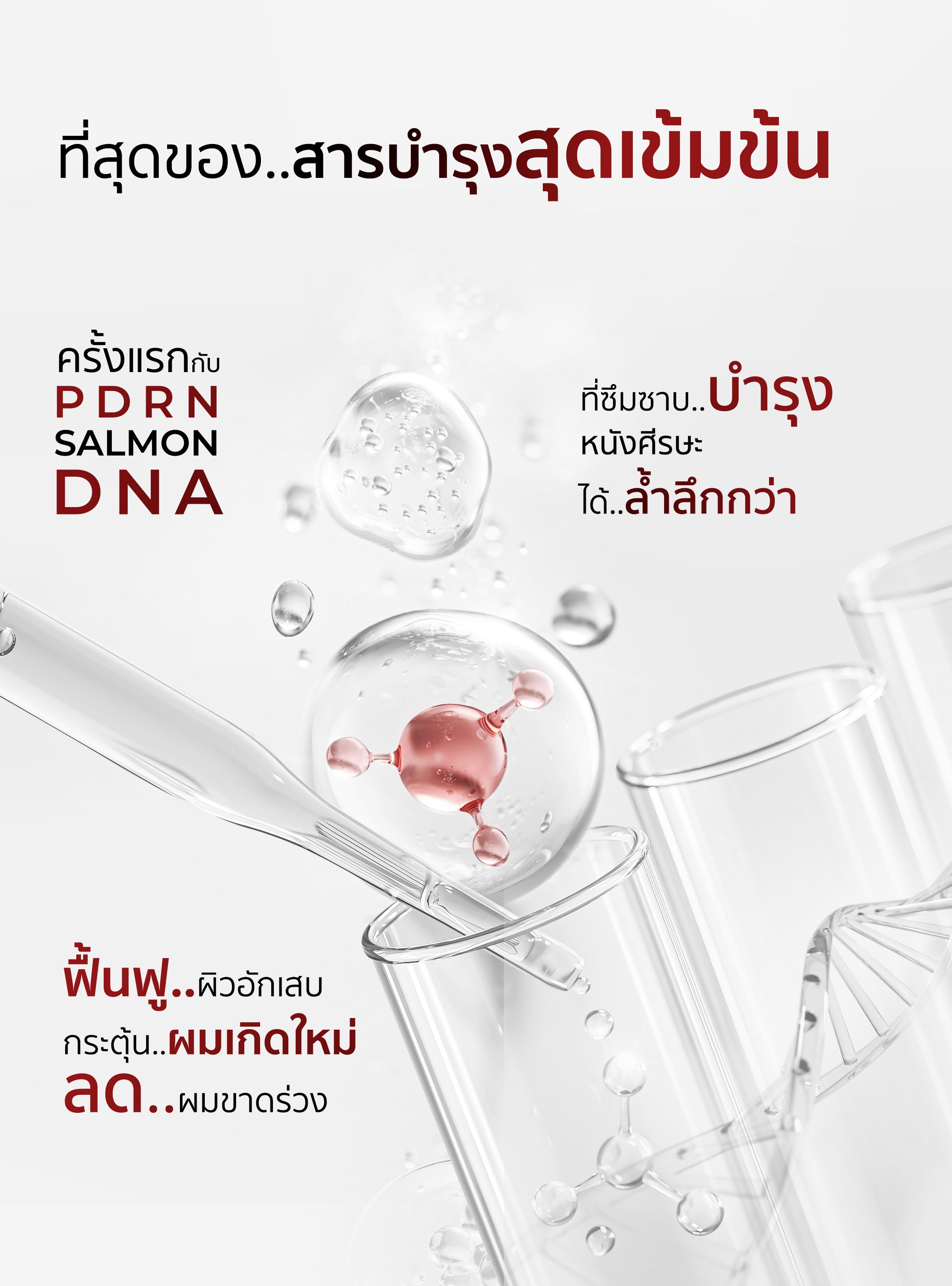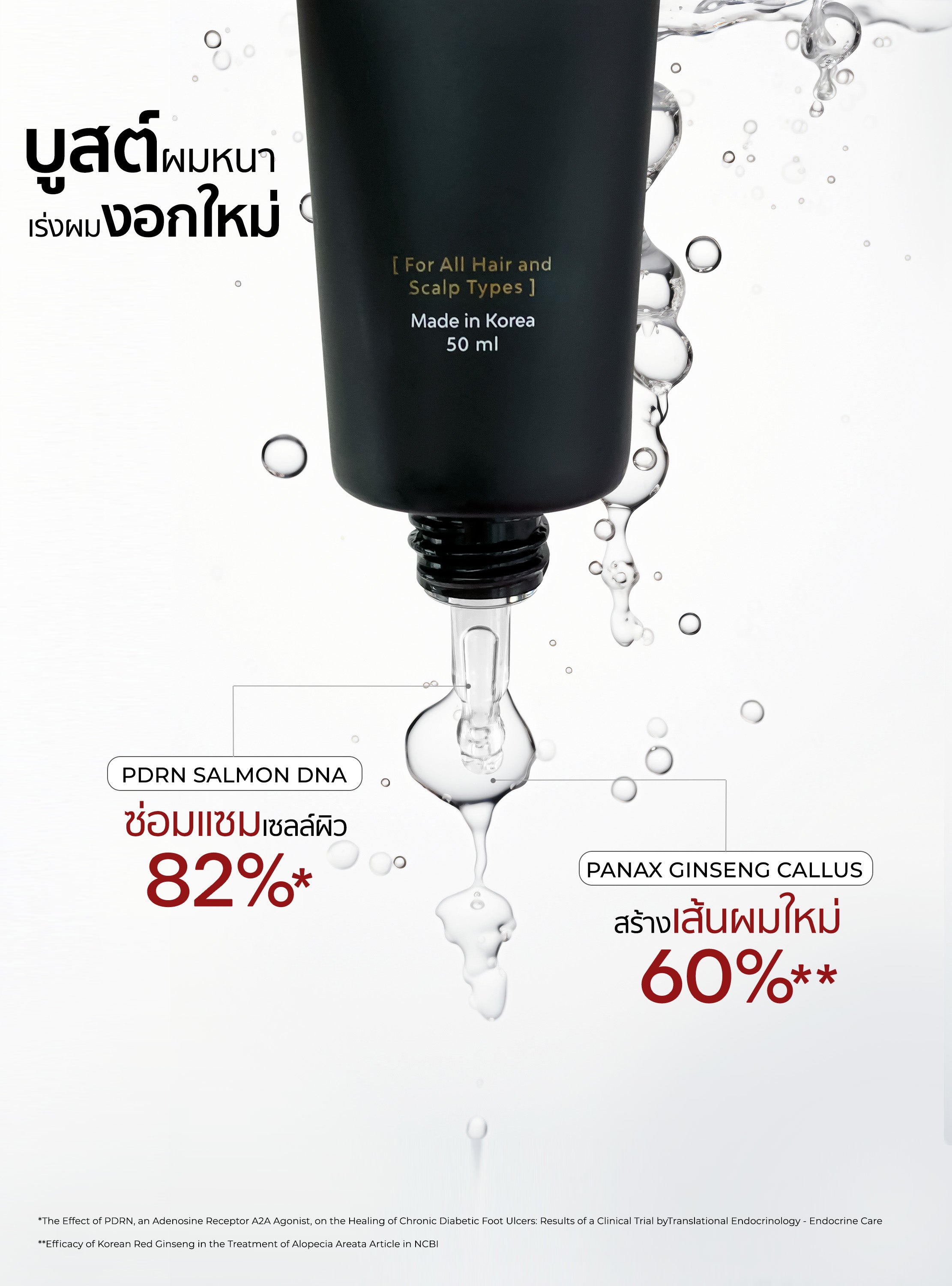 PDRN: Extracted from salmon DNA, it aids in repairing and restoring the scalp, preparing it for the development of new hair cells.