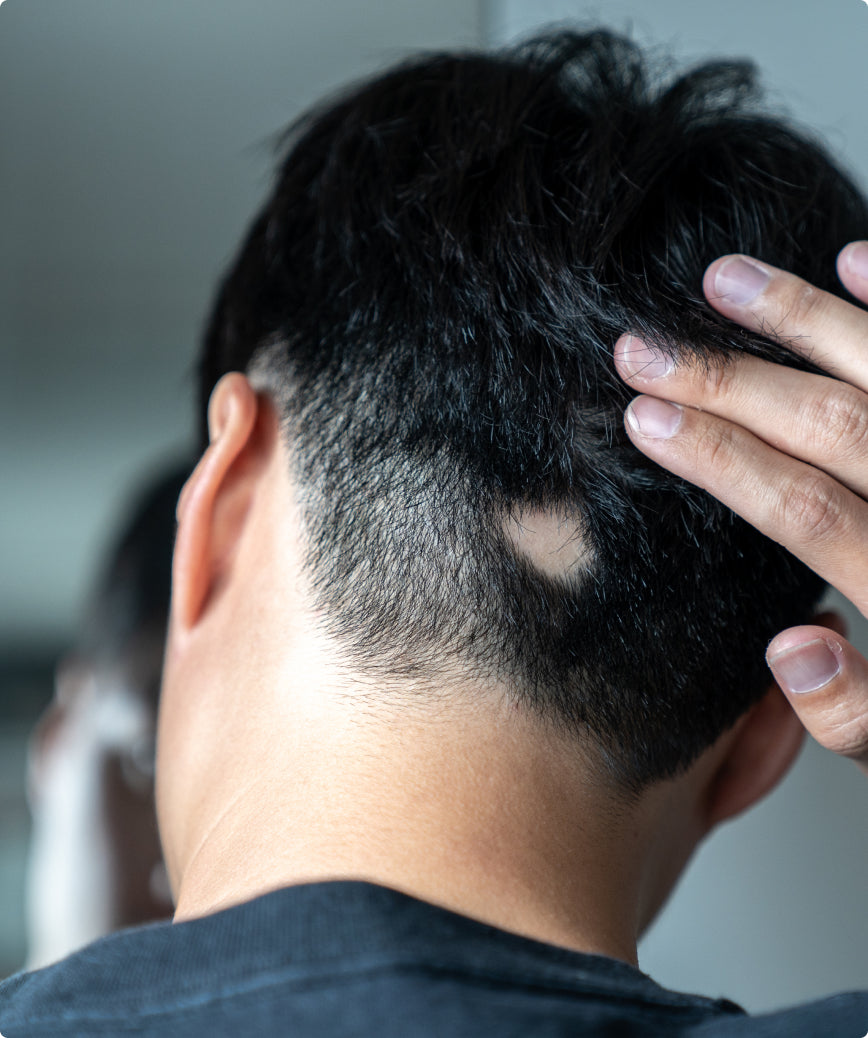 ผมร่วงเป็นหย่อม เกิดจากระบบภูมิคุ้มกันผิดเพี้ยนส่งผลต่อรากผม ทำให้ผมหลุดร่วงเป็นหย่อม เกิดเป็นวงล้านกลางศีรษะหรือจุดอื่นๆ